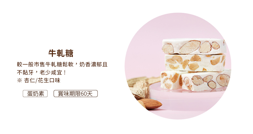 牛軋糖:【蛋奶素】精選堅果、糖、鮮奶、蛋白