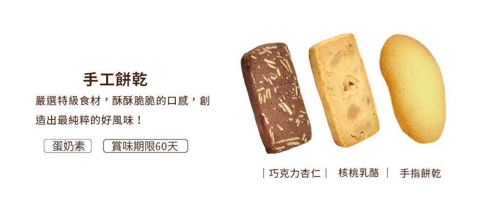 手工餅乾-巧克力杏仁:【蛋奶素】鮮奶、可可粉、杏仁片、巧克力豆、天然奶油、雞蛋、小麥粉